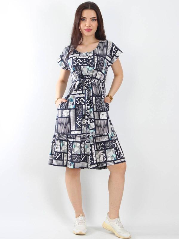 Великолепное летнее платье из нежной смесовой ткани, сочетающее модал и хлопок (50/50). Платье с коротким рукавом, застегивается на пуговицы (такий фасон еще называют платье-халат). Линию талии завышено. Красиво смотрится под поясок. Очаровательный круглый вырез. Модель средней длины. Элегантность батогом добавляет широкая оборка по краю подола. Есть карманы. Дивовижний контрастний дизайн. Оригинальный геометрический принт с яркими акцентами