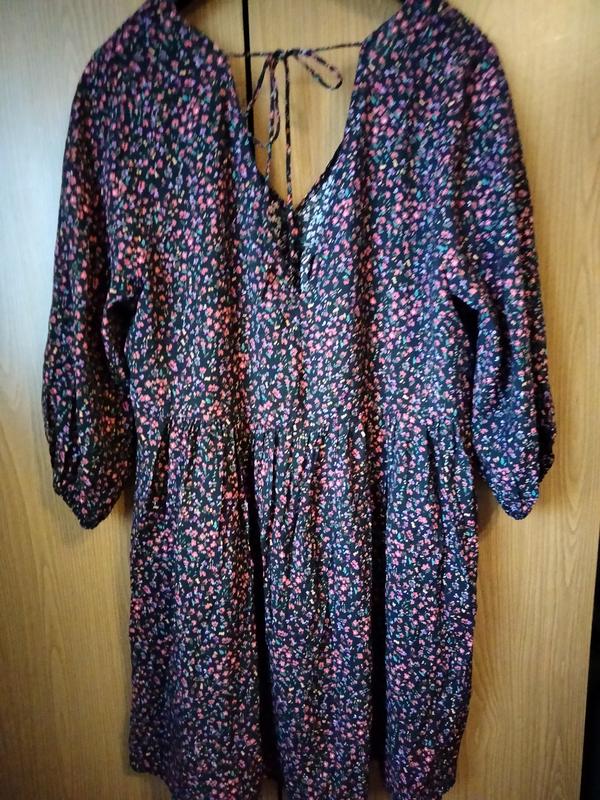 Платье черное в цветочный принт, на спине связывается на шнуровку.Рукав три четверти.Сукня из натуральной ткани+вискоза.Длина рукава 45 см, длина платья 94 см, Полуобхват груди 52 см.