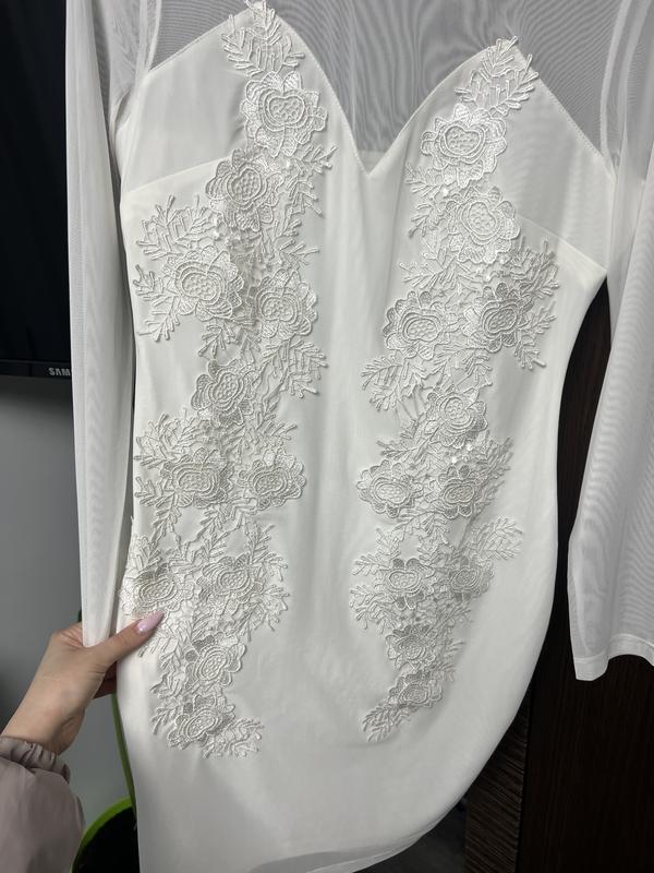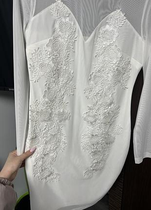 Стильна біла сукня з довгими рукавами та вишуканими мереживними вставками. Легка напівпрозора тканина на плечах додає елегантності, а об’ємне мереживо з квітковими мотивами створює ніжний та жіночний образ. Сукня прямого крою, добре сідає по фігурі та підходить як для святкових заходів, так і для романтичних зустрічей.