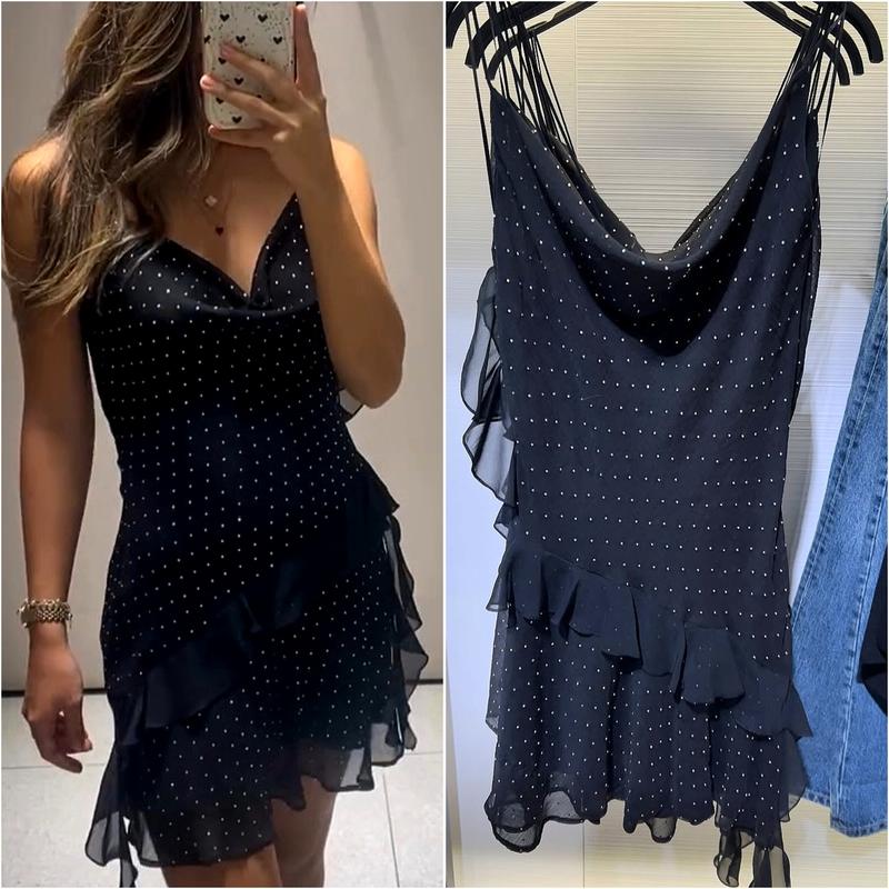Короткое платье Zara с блестящей отделкой i воланами. Платье с драпированным вырезом и тонкими бретелями. ОВНЕШНЯЯ ЧАСТЬ: 100% ПОЛІЕСТЕР ПІДКЛАДКА: 100% ВЕСКОЗА. Размер: указано М, но маломерит - идет на полноценную S, маленькую М (ориентируйтесь на замеры) Пог 44 см. Пот 36 см. Поб 47 см. Длина с бретелями 81 см. Новое (с биркой) Не хватает пара камушек (в носке не видно, в цене учтений)