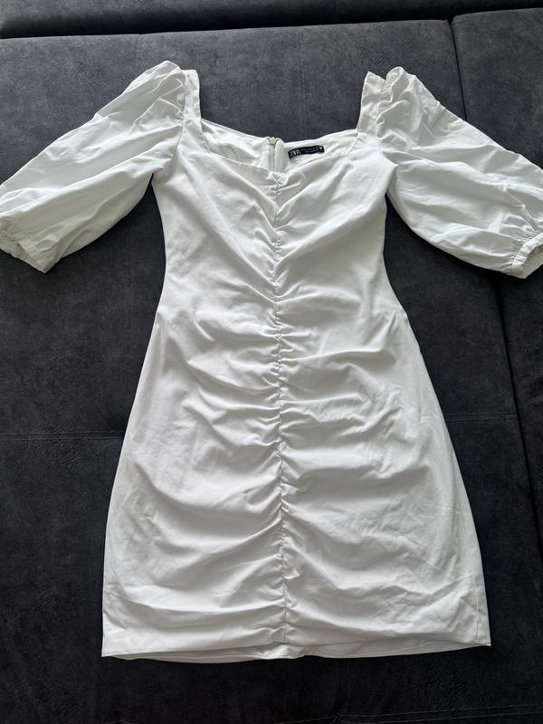 Біла сукня Zara Розмір ххs- хs Пог 35 Пот 31 Поб 46 Довжина 83 Рукав 34 Є підкладка З нюансів на останньому фото маленький слід, виводити не пробувала