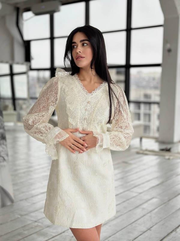 Романтичное кружевное платье с объемными прозрачными рукавами дополнено декоративными пуговицами и текстурной юбкой❤️ Ан2541 Размер: м, л Тканина: мереживо/жаккард