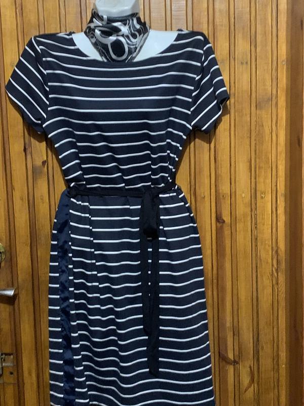 Жіноче плаття вільного крою під поясок, у біло- синю смужку . З боків оздоблене атласною темно- синьою тканиною. Склад - котон і поліестер у співвідношенні 50-50%. Розмір XXL.