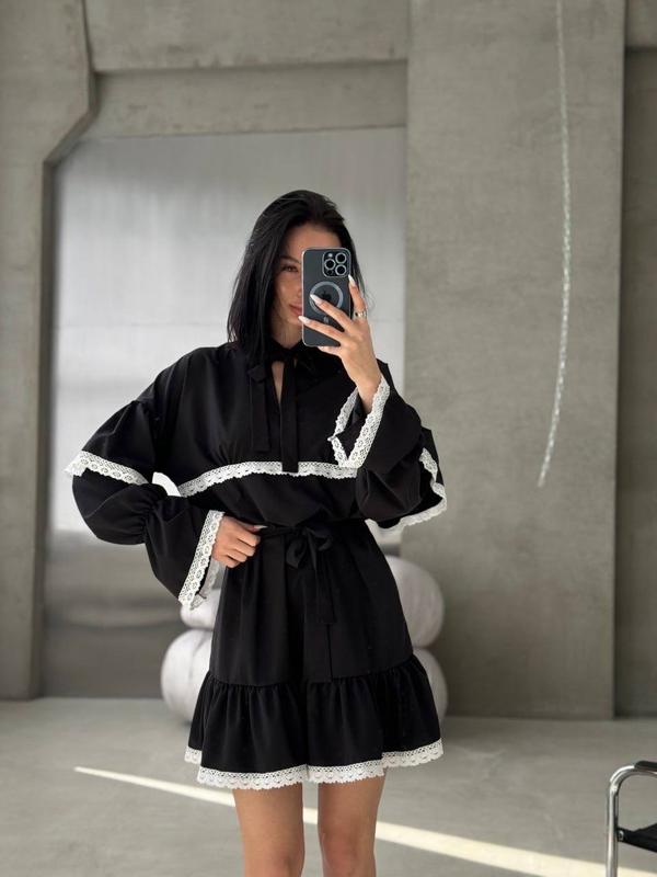 ⬆️ФОТО⬆️ Сукня Арт: 6023 sc Размер: 42-44 46-48 Цвет: Черный Описание : платье свободного кроя под пояс с воланами, и кружевом, воротничок стойка на завязке Замеры: ➖42-44 ОГ-102 ОС-106 Длина-90 Рукав от горловины-84 ➖46-48 ОГ-114 ОБ-118 Длина-92 Рукав от горловины-85 Замеры выполнены по верху изделия, возможны отклонения несколько сантиметров от измерений Ткань: плотный софт + кружево Фото реал 790 грн🌹