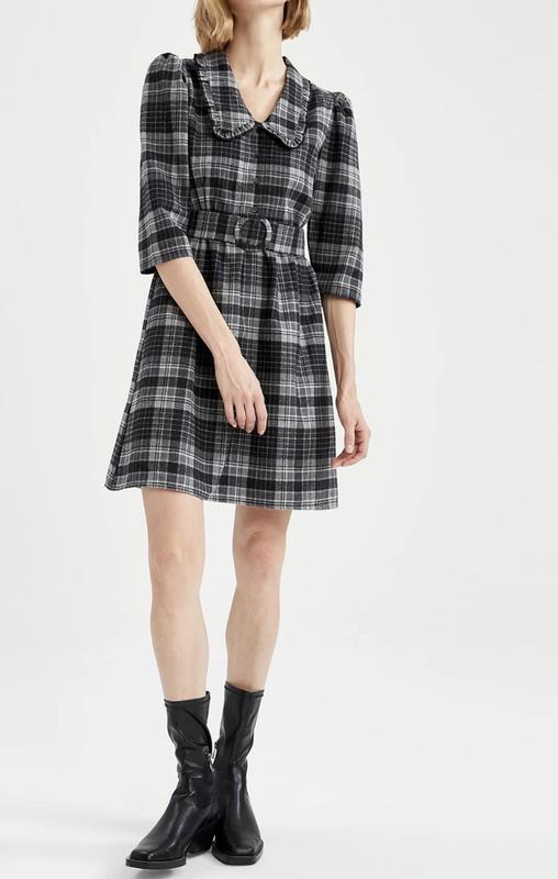Серое платье в клетку, ткань приятная и тёпленькая. На бирке указан размер 42, однако по факту это 38 Размер М