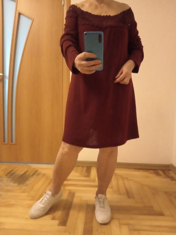 Стильная трикотажная туника платья с приспущенными плечами. По горловине красивое кружево. Выглядит супер. Состав полиэстер ткань мягкая приятная, типная трикотажного полотна, тянется. Состояние очень красивое. Размер указан 24 ПОГ -60, Поб -80, длина -80 см