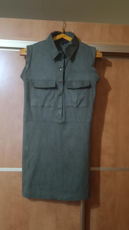 платье под замш, ткань не плотная, стрейч, застёжка кнопки, накладные карманы спереди,рубашечный воротник, размер указан XS, но можна и на S, насыщенный цвет хаки, в носке не было