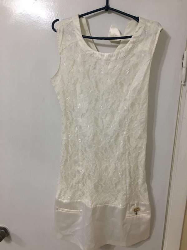Шикарное коротенькое нарядное белое платье из ажура и шелка. Снизу спереди брошка бант в камнях, В верху на спинке красивый бант. Очень оригинальное и неповторимое платьице.Размер s.