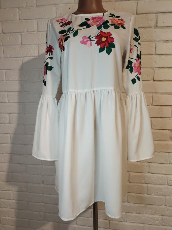 Красивое белое платье с цветочной вышивкой - идеальный выбор для праздничных событий или прогулок. ✅ Материал: легкий, приятный к телу текстиль ✅ Цвет: белый с яркой вышивкой ✅ Рукав: длинный, расклешенный ✅ Фасон: свободный крой, отрезная талия Это платье подчеркнет вашу нежность и стиль! Идеальное состояние, размер европейский 10. Замеры НПО груди до 48 см., НПО талии до 44 см., НПО бедер до 60 см., длина рукава 59 см., длина платья 86 см.