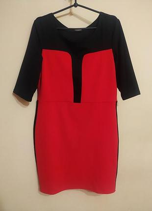 Стильне молодіжне жіноче плаття червоного кольору з чорним верхом, рукавами три чверті та полосками збоку, які гарно підкреслюють фігуру, підійде як для святкових подій, так і для офісу. Тканина якісна, тягнеться, не мнеться, плаття гарно лягає по фігурі. Ідеально брати в дорогу. Розмір орієнтовно 50-52 (XL). Заміри: довжина по спині 91 см довжина рукава 39 см півобхват бюсту 50 см півобхват талії 48 см півобхват стегон 55 см