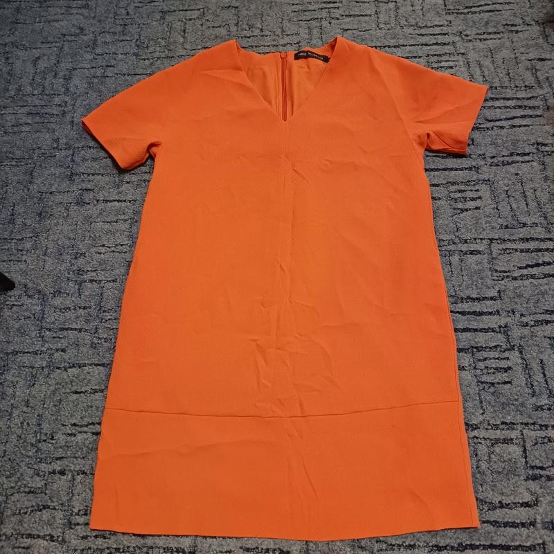 сукня з коротким рукавом пряма з V-подібним вирізом з підкладкою є кармани з боків ззаду замок гарний, насиченний помаранчевий колір розмір 14