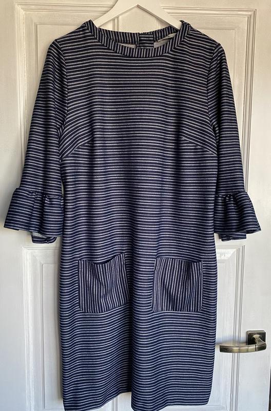 Красивое теплое трикотажное платье темно-синего цвета в полоску от бренда TU. Размер: 16 (английский, соответствует 42-44 европейскому). Крой слегка приталенный. Застегивается сзади на замок. Рукав 3/4. Тканина не тонка, гарно тягнеться. Без подкладки. В идеальном состоянии. Но в двух местах слегка взорвался шов (на фото видно): на вытачке возле бокового шва и сзади по среднему шву. Плечи 40 см ПОГ 52 см ПОТ 50 см ПОБ 55 см Низ 58 см Длина по спинке 94 см