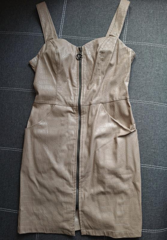 Качественный кожаный комбинезон платья на молнии по всей длине бежевый, размер 42-44