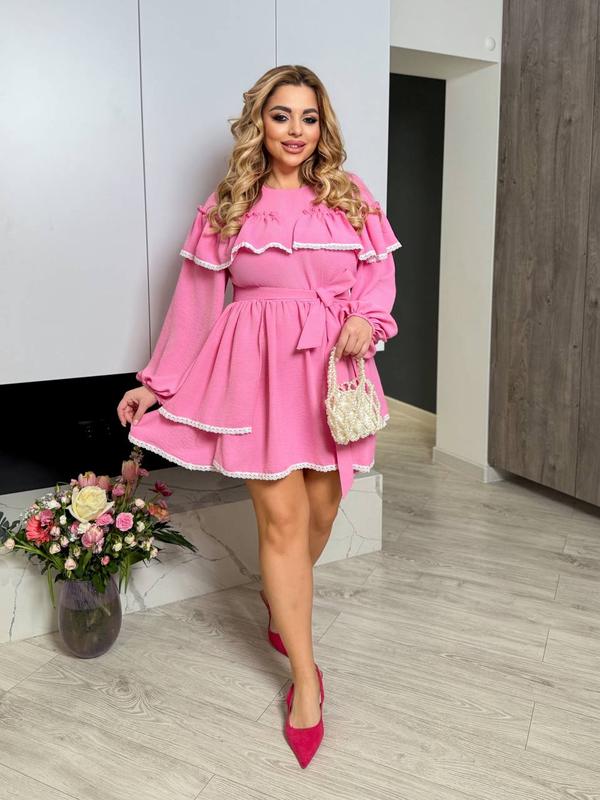‼️ОТПРАВЛЕНИЕ ВПРОДОВЖ 2-5 РАБОЧЫХ ДНЕВ!!️ Фото реал Женское платье свободного кроя с кружевом🔥 Размер: S, M, L, XL(можно надевать до 52 размера). Ткань: жатка, очень приятная на ощупь, не просвечивается. Цвета: белый, голубой черный, розовый. Модель очень красивая и женская, с баской, которая одевается отдельно и регулируется по талии завязками. Супер качество 🔥🔥 Модель 824КФ