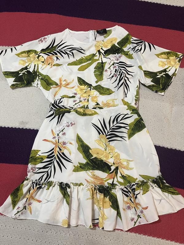 Очень красивое шифоновое платье в цветочный принт. Размер Л, будет и на М. Стан новой, не имеет пояса. Внизу рюшка
