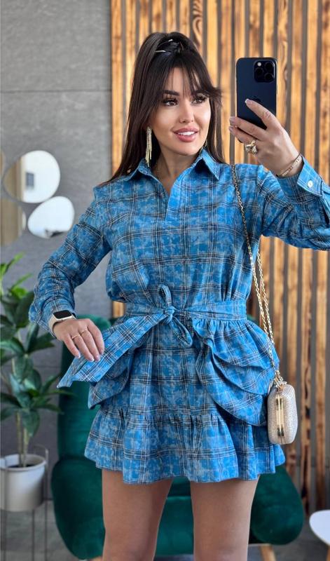 Женское платье с воротником в клетку с длинным рукавом и баска м522