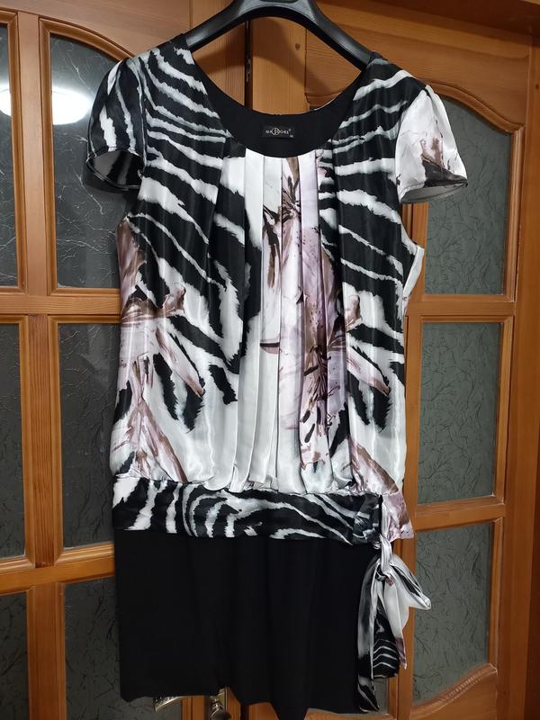 Трикотажное платье с интересным принтом. С г53, С т 53,Сб 50.На подкладке, с двойной трикотажной юбкой. Длина изделия 95, юбки 34. Прикрашений бантом на бедрах..Рукав 14. Ориентируйтесь по замерам.