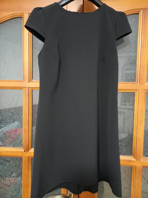Интересное черное платье в форме трапеции. Сг 46, Ст 46 Сб 48.Длина спереди 82, сзади 89.Ширина внизу 65, рукав 11, слегка присборенный вверх.