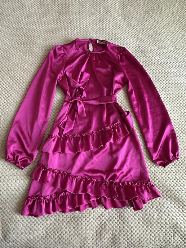 Атласное малиновое платье Очень приятный на ощупь, одевала один раз Есть небольшой дефект на последнем фото Дополнительно есть пояс