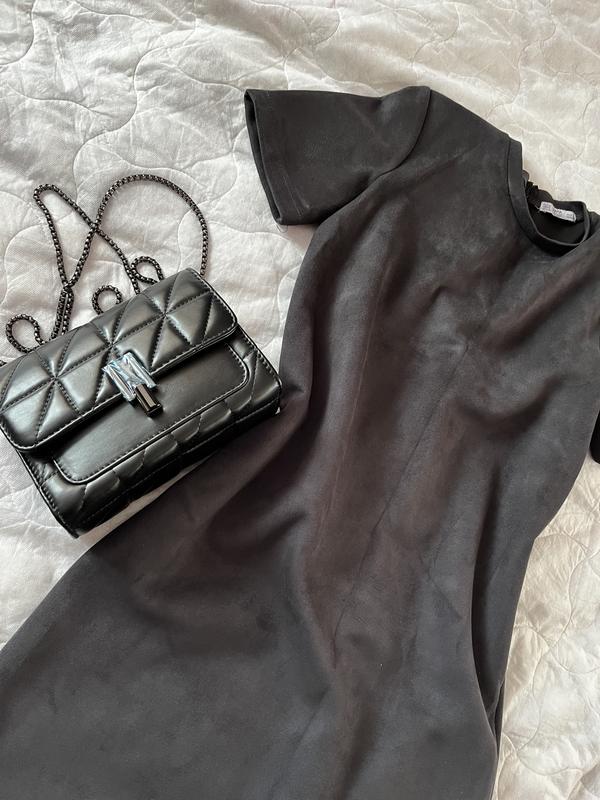 Замшевое платье,стан идеальное, прямого кроя,легкая, не парит, красиво держит форму)цвет темный графит, смайлик черный,камера немного засветляет)