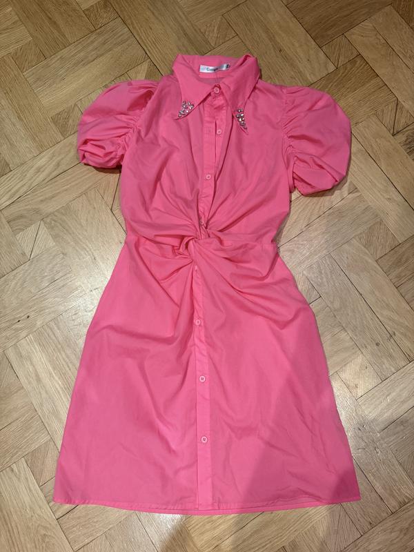 Рожева сукня-сорочка. Платье с акцентом на талии и элегантными рукавами-буфами идеально подходит для любого случая. Сочетайте его с туфлями на каблуке для утонченного образа или босоножками для более непринужденного стиля. Отложной воротник, воротник украшен камнями, планка с пуговицами спереди. Размер S/M