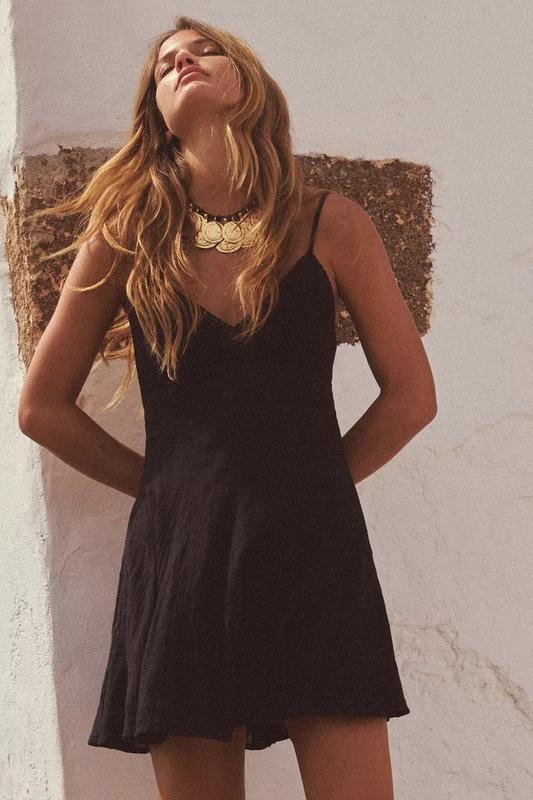 XS-XXL Короткое платье с V-образным вырезом и тонкими регулируемыми бретелями. С вышивкой в тон, подкладкой и скрытой молнией сбоку.