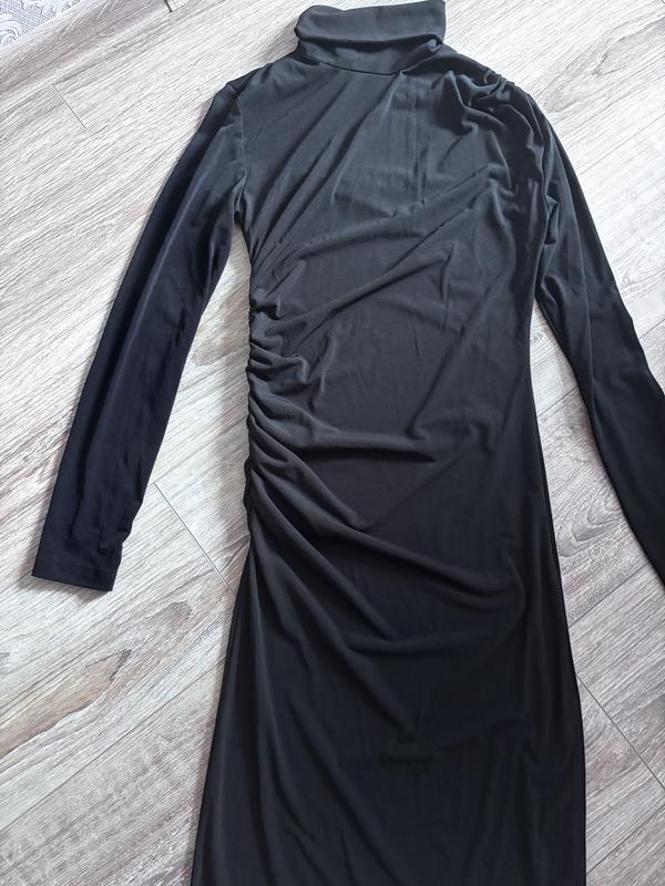 Плаття чорного кольору під шию.Красиво підчеркує фігуро.Підходить на розмір XS абоS.Довжина середня.Жатка на одному пличі та на талії