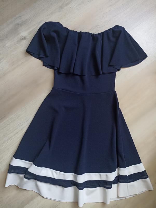 красивое платье в талию с деорированным низом, плечи на резинке, красивая плотная ткань, темно синего цвета