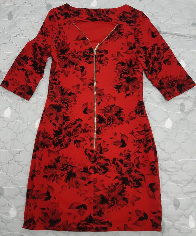 Красное платье с принтом в розы. Рукав трехчетвертикальный. Размер - М Длина платья по спине - 85 см п. ОТ - 36 см п. ОГ - 43 см Сзади расстегивается замок.
