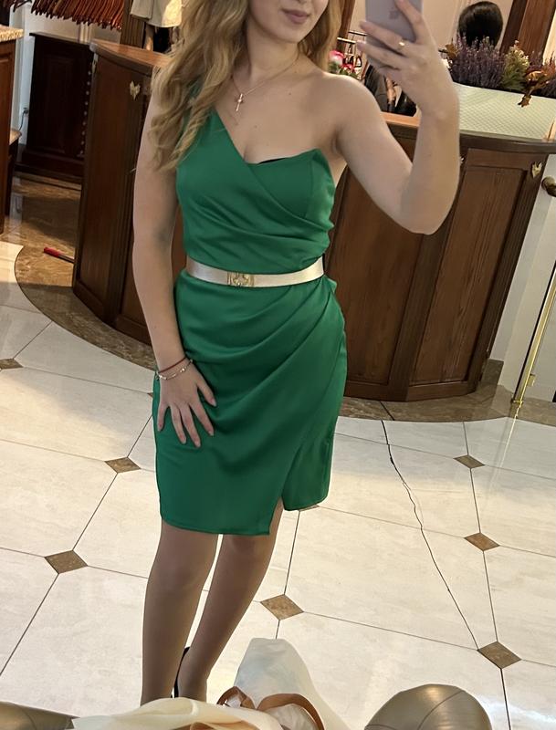 Изумрудно-зеленое асимметричное платье с одним открытым плечом, легкими драпировками, разрезом сбоку и золотистым поясом на талии. Элегантный и стильный выбор.