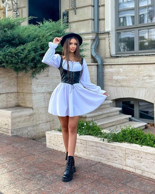 542 Если ты мечтаешь об идеальной талии- это платье именно для тебя. Благодаря своему покрою отлично подчеркивает талию. Спинка на потайной молнии. Ткань: натуральный коттон + эко кожа Размеры: 42-44, 46-48 Цвета: белый, мокко Отличное качество