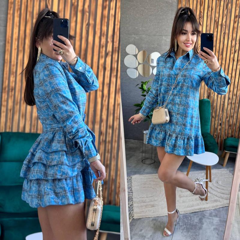 Платье с баской варенка коттон голубое в клетку