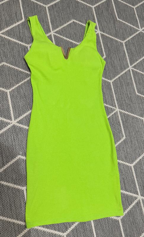 Облегающее трикотажное платье из эластичной ткани в насыщенном зеленом цвете. Модель имеет широкие бретели и глубокий V-образный вырез с декоративной металлической вставкой, имеет чашечки внутри. Длина - мини Отлично подходит для вечернего выхода или летней прогулки.