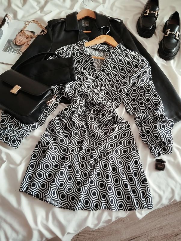 Платье от George выполнено в черно-белой гамме с оригинальным геометрическим принтом. В новом состоянии Размер 12 М Длина 87 ПОг до 50 ПОт 37-47 ПОб 50 Рукав 57 100% вискоза