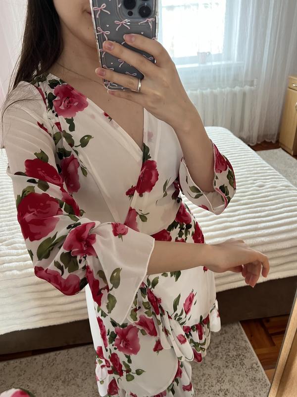 Біла жіноча сукня на запах в квіти. Підходить на різний об‘єм за рахунок крою (ХС - М) В ідеальному стані! На зріст 165-168