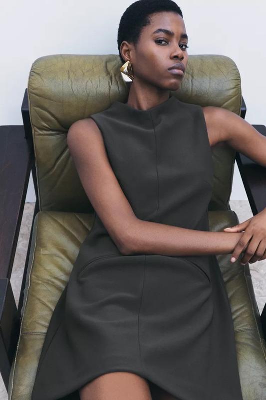 XS,S,M,L Короткое платье с круглым воротником и без рукавов. Имеет имитацию карманов спереди и скрытую молнию сзади.