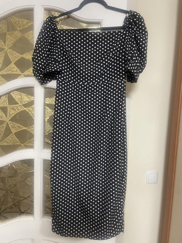 Черное платье в белый горошек, размер s, длина до половины колена, с рукавами-фонариками, состояние новое.