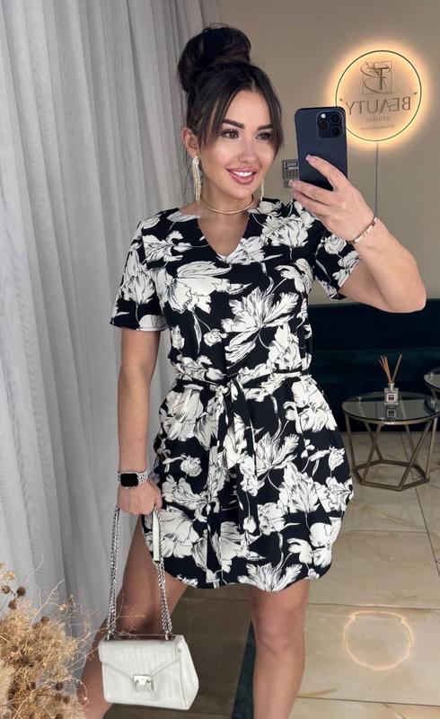 Женское летнее платье с поясом с цветочным принтом двухцветное и с треугольным вырезом