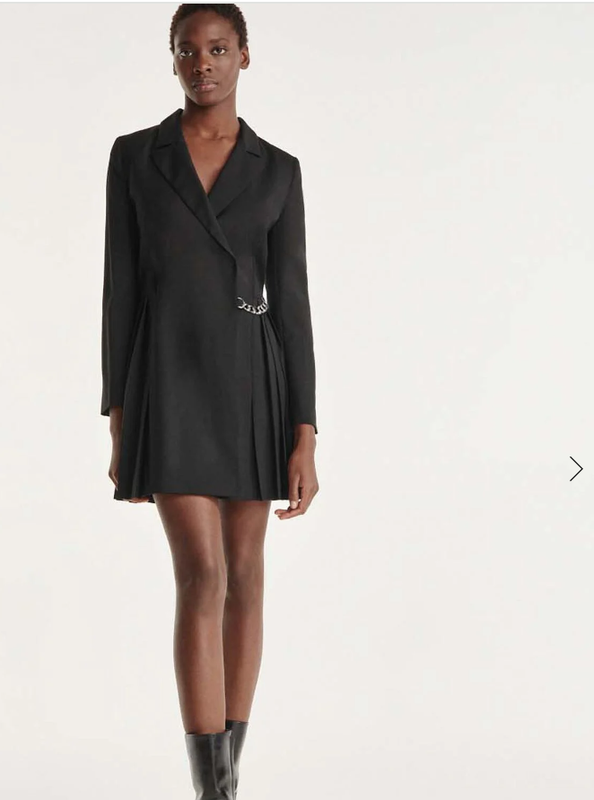 Блейзер-сукня з ланцюжком The Kooples. Вовна. Брала за 250євро Ця чорна сукня переосмислює традиційний костюм у витонченому, облягаючому стилі. Вона зберігає досконало структурований крій класичних піджаків зі штаниною на плечах та реверсним коміром. Ансамбль підкреслюється складками по боках і має подвійний ряд ґудзиків, що веде до легко розкльошеного нижнього краю. Створіть вишуканий образ, надівши цю коротку сукню з великим срібним прикрасами та чоботами на підборах.