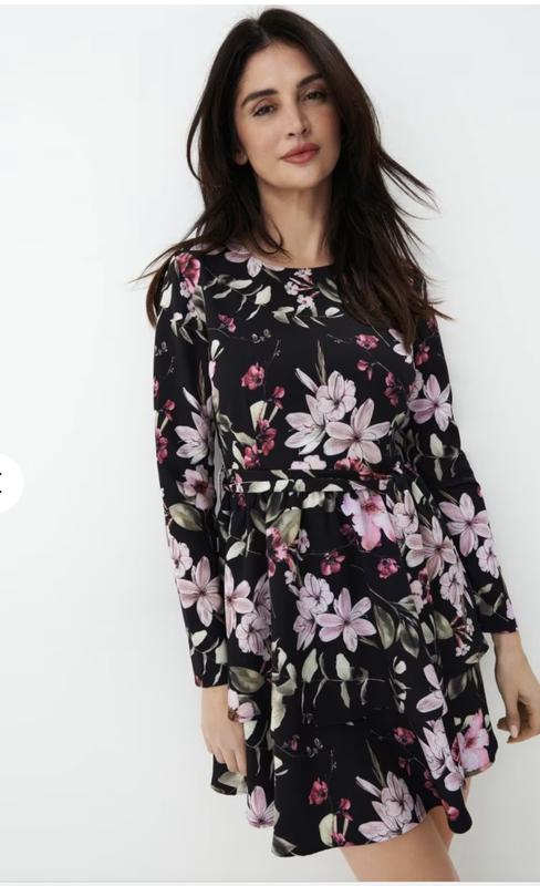 Платье-мини, с цветочным принтом, Mohito, одета один раз, длина 87 см, есть небольшой дефект у застежки, не тянется.