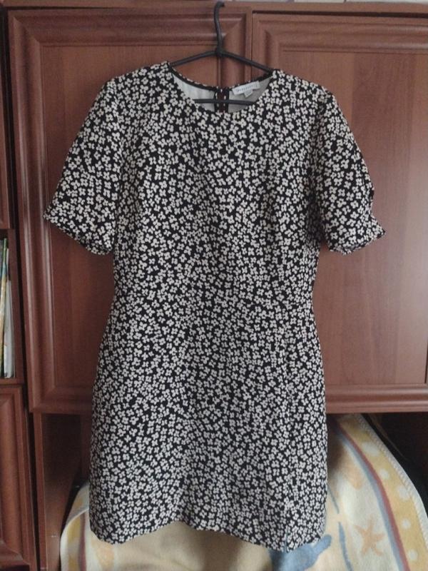Брендовое платье в принт цветы. С небольшим разрезом с левой стороны. Сзади на спинке на пуговицах и на молнии.