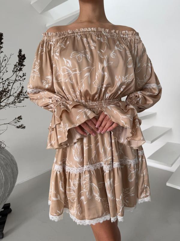 Арт. SV 603 Ткань: королевский шелк Цвет: черный, бежевый Размеры: S- M, L-ХЛ (мест) Описание: Нежное легкое платье мини длины с открытыми плечами и кружевом.Модель с резинкой на талии, рукава декорированы рюшами.. (Заміри вказані на параметри)
