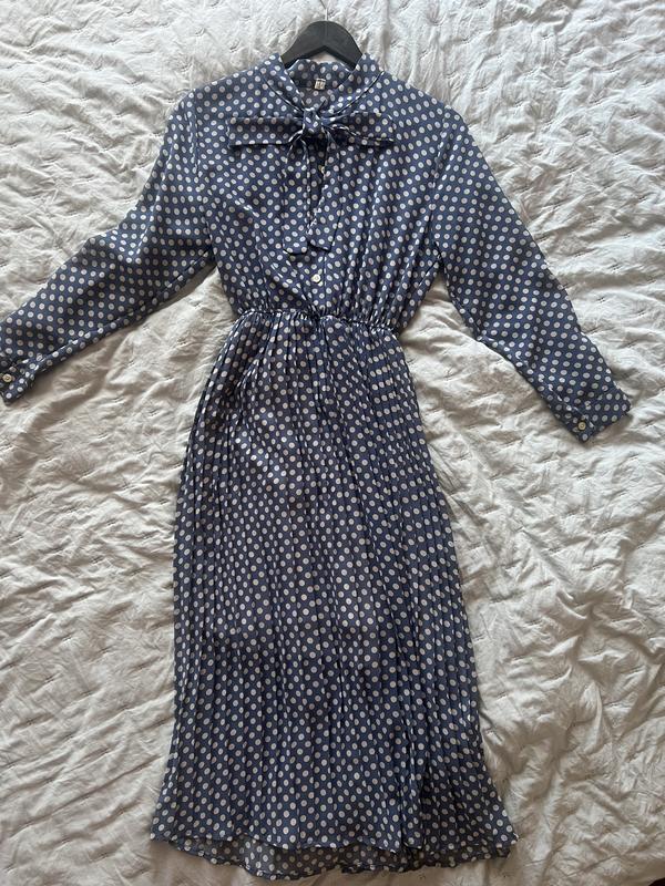 Платье в горох - вечная классика. Имеет плиссированной юбку, сверху можно завязать бант. Цвет синий с бело-серым горошком. Размер М