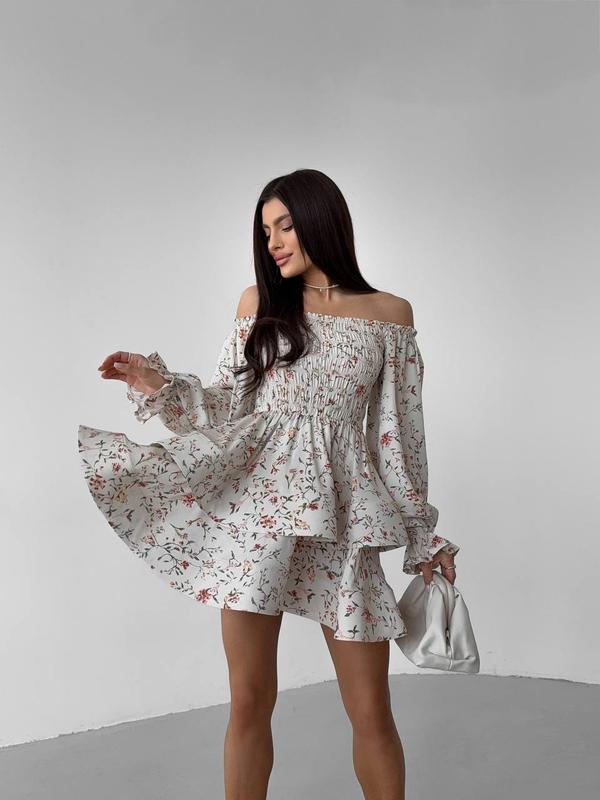 Короткое платье с открытыми плечами и пышной юбкой 4 цвета