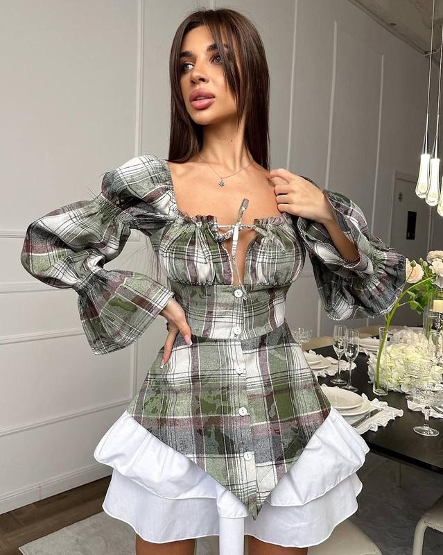 Трендовое платье в клетку с корсетным силуэтом и расклешенными рукавами в зеленом цвете