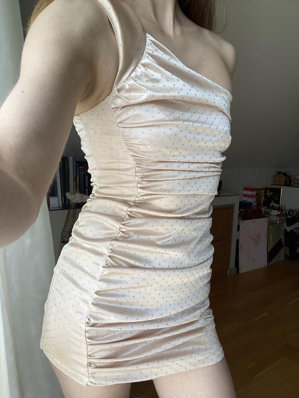 Перламутрова сукня на вечірку або день народження. Красива персикова тканина з переливом. Довжина від наплечика- 70 см. Ширина у грудях - 28 см. Тканина стрейчева і лягає по фігурі. Колір найкраще передає останнє фото- персиково-перламутровий. Розмір с, але піде і на ХС