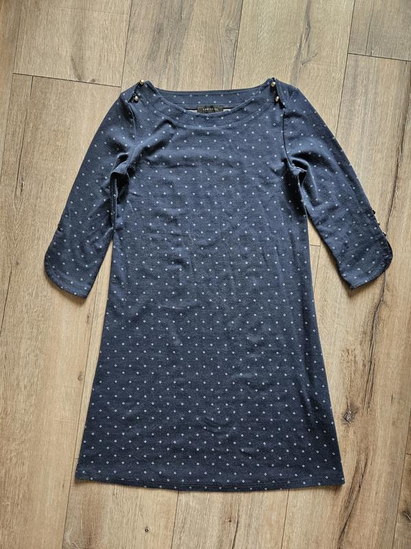 Темно-синее платье, на рукавах украшено пуговицами, удобное и классическое, садится по фигуре