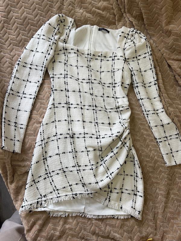 Платье трендовое из твида, на размер хс-с. Полуобхват талии 36 см, полуобхват груди 40 см, длина спереди 78 см, сзади 82 см.