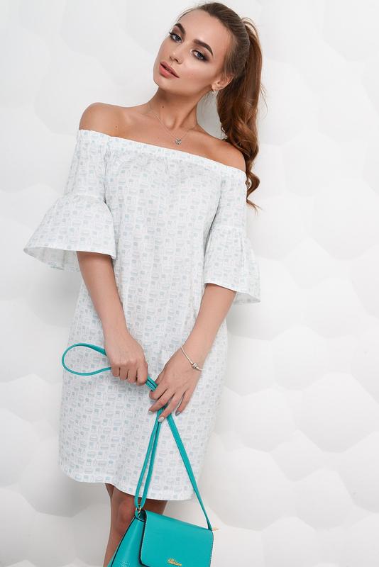 Летнее платье прямого силуэта с узором по ткани. Линия спущенного плеча на резинке. Короткий рукав оформлен рюшей в цвет изделия.