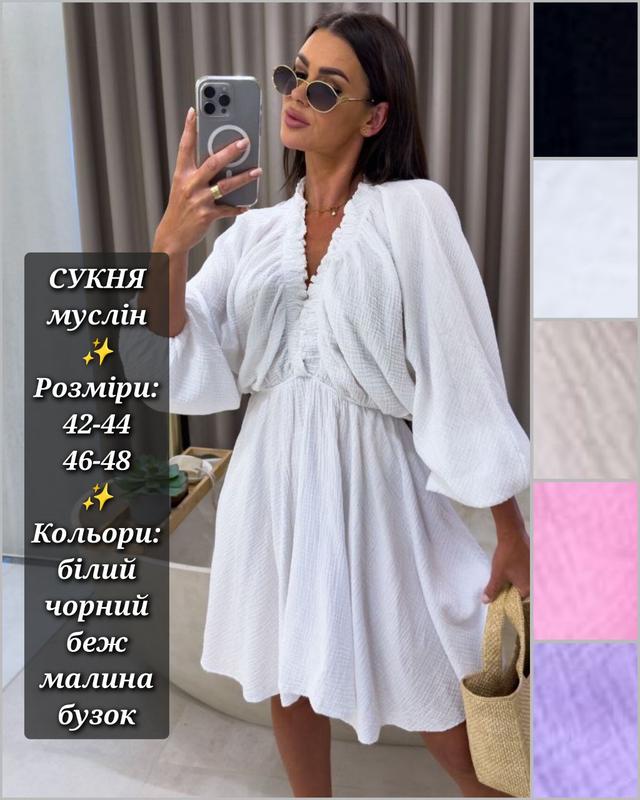 Сукня арт. 073 Ткань: муслин Размер: 42-44, 46-48 Цвет: белый, черный, беж, малина, сирень